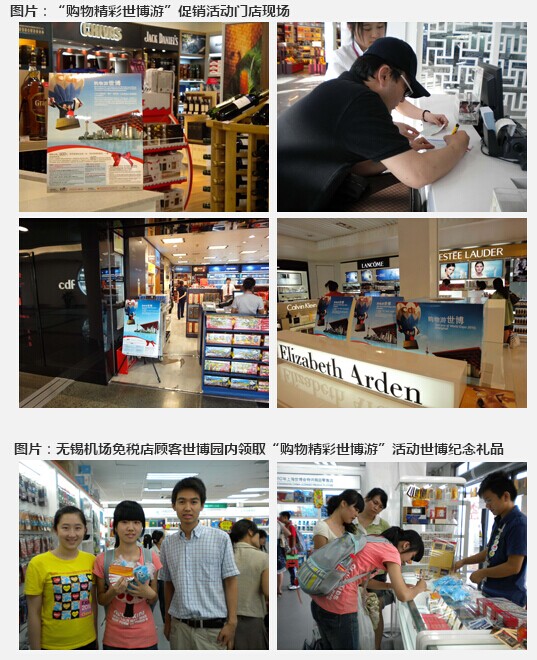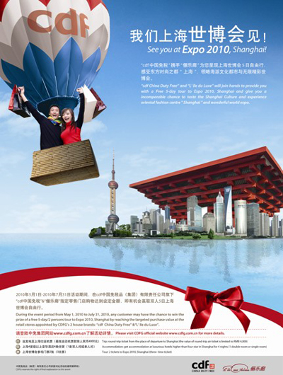 中免集團利用2010年上海世博會所帶來的商機,聯(lián)合集團下屬零售門店及品牌供應(yīng)商進行了以“購物精彩世博游”為主題的聯(lián)合促銷活動?;顒託v時4個月,從2010年5月1日開始,并于2010年8月31日精彩落幕。