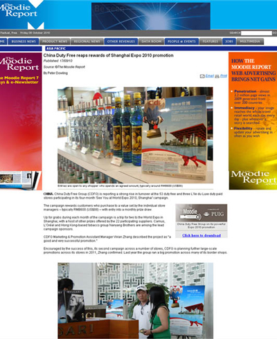 “精彩購物世博游”促銷活動受到全球免稅權(quán)威雜志穆迪報告(The Moddie Report)關(guān)注,并以專訪形式在慕迪報告網(wǎng)站和雜志上刊登了專題報道。