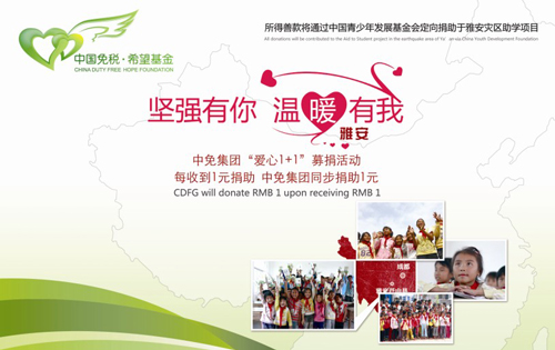 在四川雅安地震發(fā)生后,中免集團(tuán)與中國青少年發(fā)展基金會(huì)(以下簡(jiǎn)稱“青基會(huì)”)緊急協(xié)商籌備,決定通過“中國免稅希望基金”,在中免集團(tuán)全體員工、各下屬門店以及門店消費(fèi)者中發(fā)起主題為“愛心1+1”的募捐活動(dòng)。 “愛心1+1”即中免集團(tuán)將對(duì)消費(fèi)者所捐善款按1:1進(jìn)行配比,最終通過青基會(huì)用于雅安震后教育設(shè)施恢復(fù)和兒童復(fù)學(xué)項(xiàng)目,同時(shí)中免集團(tuán)也將通過官網(wǎng)與官方微博第一時(shí)間公布善款使用情況,所有捐款接受專項(xiàng)審計(jì)?;顒?dòng)將持續(xù)至5月20日,在此期間,公眾可在中免集團(tuán)三亞免稅店以及各邊境、機(jī)場(chǎng)免稅店參與本次愛心捐助活動(dòng)。